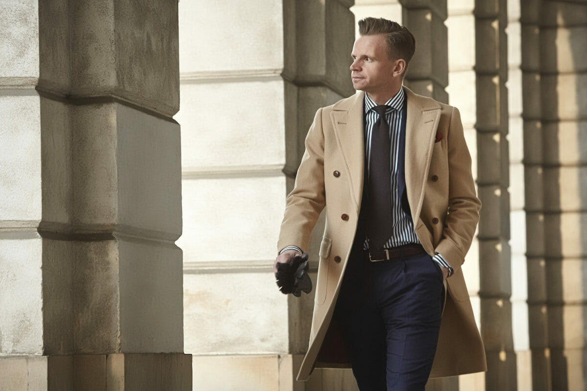 Płaszcz polo dobrze się nosi ze swetrami, ale pasuje też do garniturów. Jest to okrycie mniej oficjalne od dyplomatki, stanowi więc naturalne uzupełnienie dla całej garderoby półformalnej. Ale, jak widać na zdjęciach, polo coat ZACK ROMAN sprawdza się także w standardowym zestawie biznesowym – z granatowym garniturem i prążkowaną koszulą.