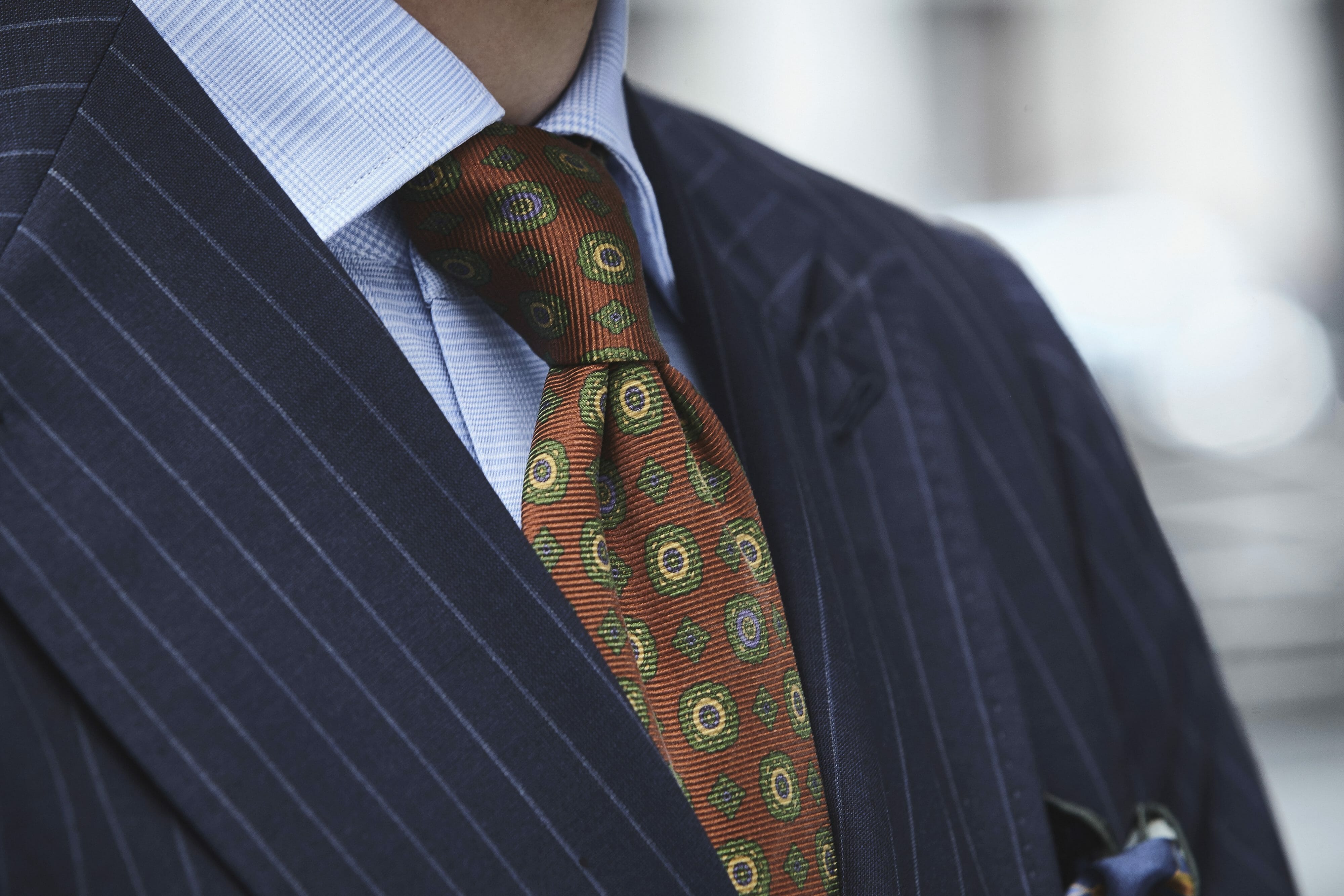 Na koniec o tym, co szczególnie cieszy oko wyczulone na estetyczne niuanse. O ile w biznesie dominują krawaty gładkie i połyskliwe krawaty, o tyle tutaj widzicie matowy, w dość skomplikowany wzór. To prawdziwa gratka, ancient madder silk. Tradycyjne dodatki tego typu mają głębokie, przygaszone kolory i wyjątkowe desenie retro. W Polsce należą do rzadkości. Krawaty z mojej kolekcji ancient madder wykonano z absolutnie unikalnego materiału, który znalazłem w archiwach lombardzkiej manufaktury Fermo Fossati. Są ciekawe stylistycznie, dodają ciepła naszemu ubiorowi. Świetnie łączą się z tkaninami garniturowymi o matowym odcieniu (flanela, tweed, ale też tropik i bluefeel).