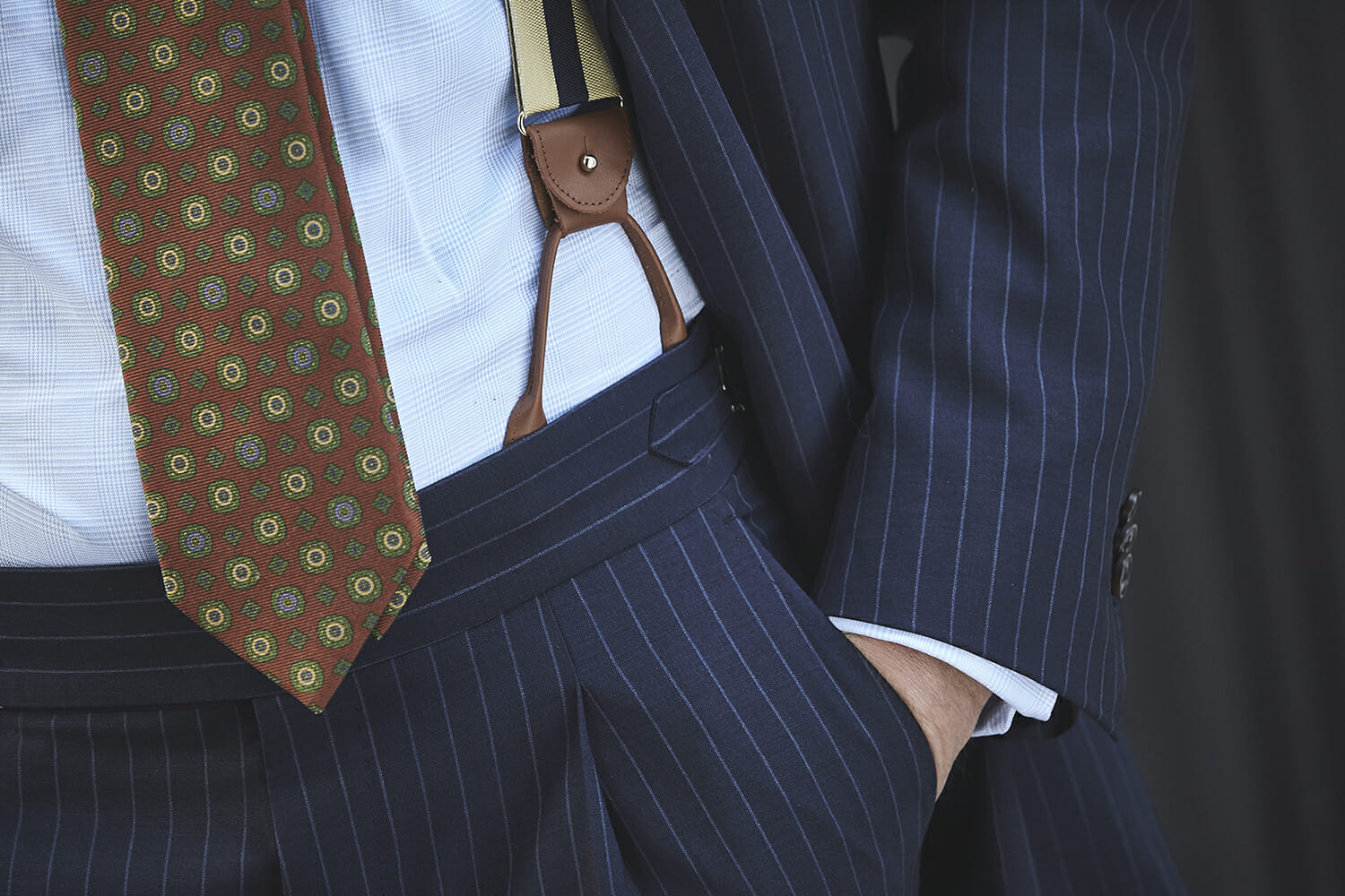 Spodnie mają, jak to u mnie, wysoki stan i zakładki. Idealnie pasują do szelek, dodatkowo zostały wyposażone w boczne regulatory. Są bardzo komfortowe, a zwężająca się u dołu nogawka ujmuje im ciężaru. Ja zdecydowałem się na szeroki makiet, żeby jeszcze urozmaicić całość. Idealnie pasuje do garnituru dwurzędowego.