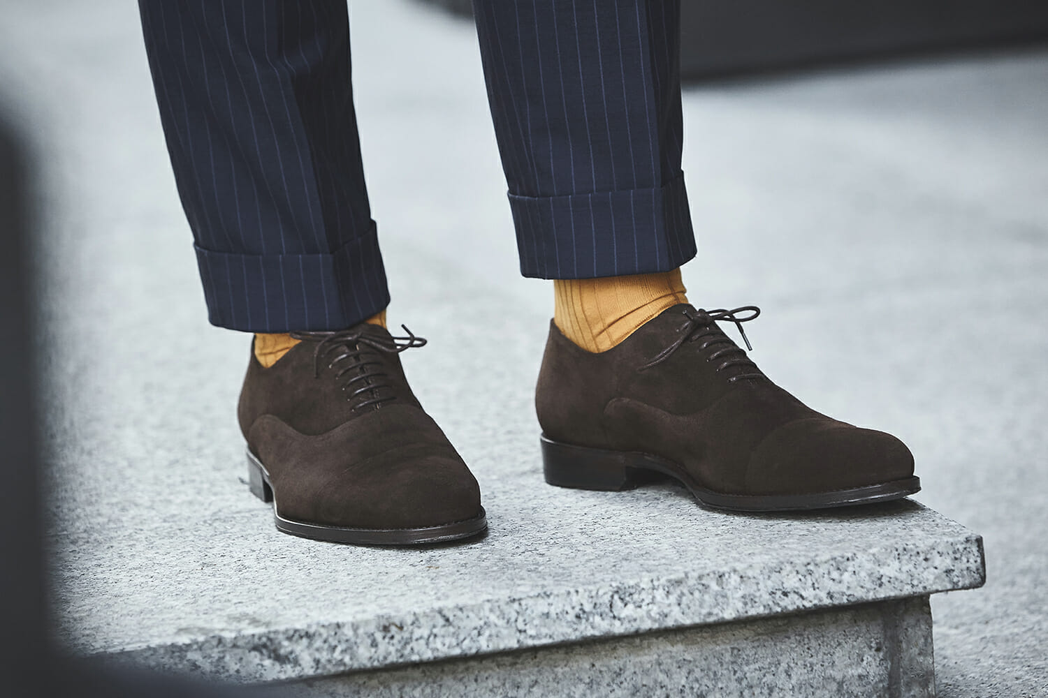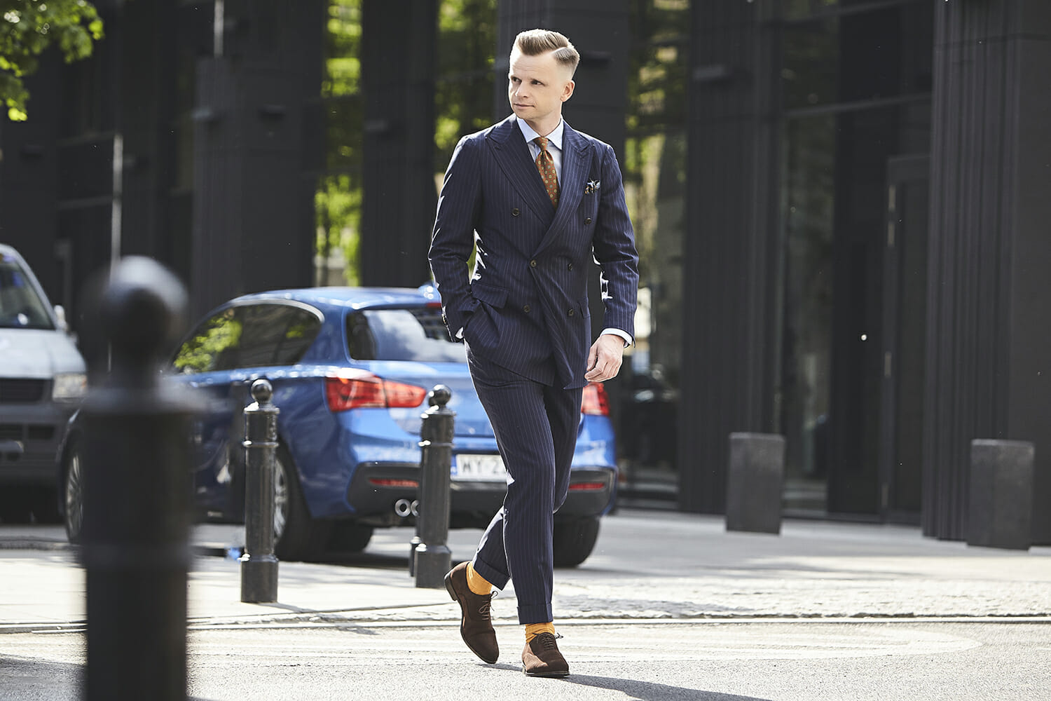 Formalność zestawu obniża jego dolna część. Brązowe buty zamszowe są mniej oficjalne niż czarne ze skóry licowej. Pomarańczowe, przyciągające uwagę skarpetki to element mający zaskakiwać. Power suit wygląda dość poważnie, więc warto się trochę pobawić z konwencją.