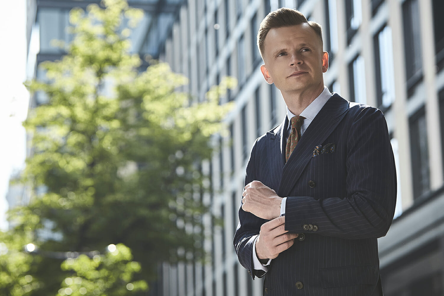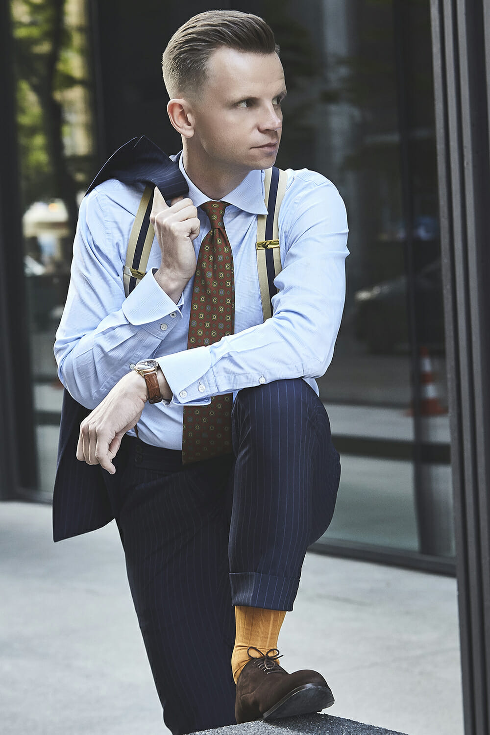 Ten sam garnitur mógłby zostać zestawiony z chłodnymi, formalnymi dodatkami – jak biała koszula czy granatowy krawat z jedwabiu. Ja uzyskałem efekt przełamania biznesowych reguł. Zdaniem niektórych taki właśnie, zindywidualizowany styl może bardzo pomóc w budowaniu zawodowej pozycji. Na pewno tworzenie tego rodzaju stylizacji jest świetną zabawą.