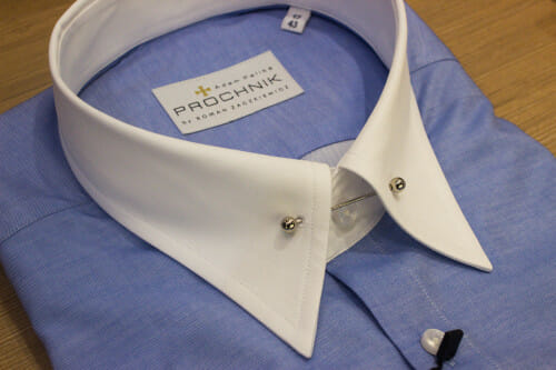White pin collar with a metal barbell. Twill shirting from Testa