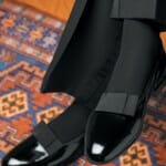 Buty powinny być bezwzględnie czarne, wykonane z lakierowanej skóry. Większość osób założy oxfordy. Tradycyjnym rozwiązaniem są jednak lakierowane pantofle wieczorowe, czyli eskarpiny.