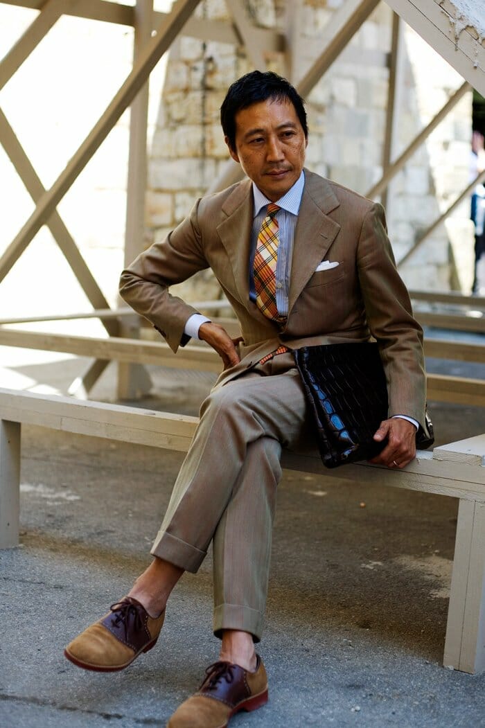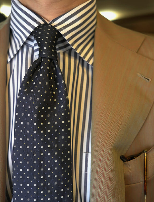 Solaro jest letnią tkaniną, do której warto wybrać swobodny krawat w ciemnym kolorze dla wyrównania kontrastu kompozycji. Będą pasować: granat, czarny, szary albo ciemny brąz. Krawat typu knit, grenadyna lub drukowany jedwab. Najlepiej bez podszewki. Do tego brązowe mokasyny albo zamszowe siodłaty, oczywiście bez skarpet i nonszalancko wetknięta poszetka w kieszonce piersiowej. Całość pięknie dopełni kapelusz panama.