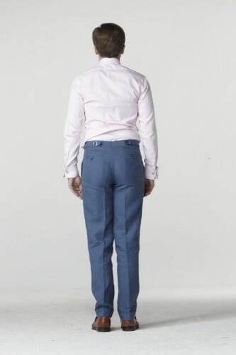 Piotrowi udało się w końcu „złapać” moją figurę i stworzył spodnie idealne. Pięknie idą po boku, mankiet ma jedno delikatne załamanie na bucie. Są doskonale dopasowane w pasie, w tyłku i w kroku. Nie uciskają, a z drugiej strony nie są za luźne. W spodniach lnianych na lato nie chciałem paska, a szelki przy tak dopasowanych spodniach są zbędne. Świadomie wybrałem tylko sprzączki z boku, spodnie są bez szlufek.