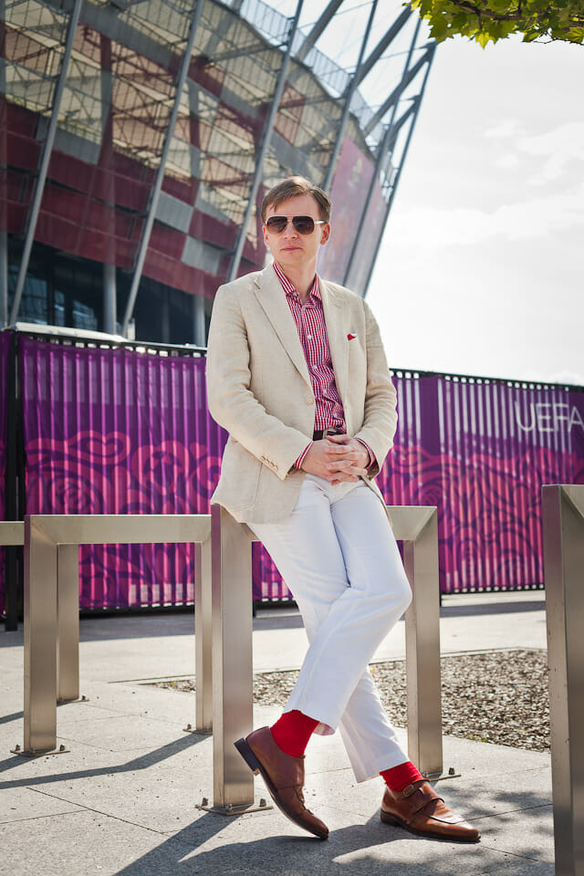 Strój kibica reprezentacji Polski: marynarka lniana, bawełniane spodnie chinos oraz koszula w kratkę gingham. Czerwone skarpety i buty monki na dwie klamerki