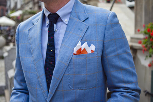 Pomarańczowa poszetka, błękitna marynarka, krawaty typu knit