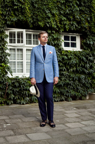 Błękitna marynarka w kratkę, krawat typu knit, nakładane kieszenie, granatowe spodnie, buty spectators