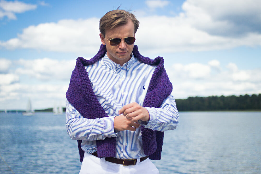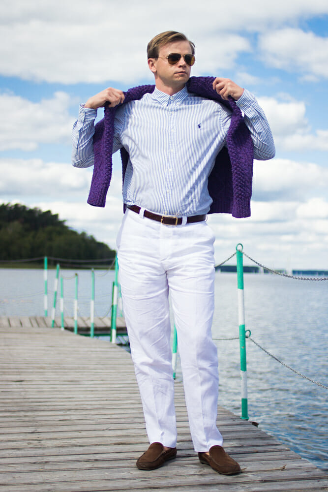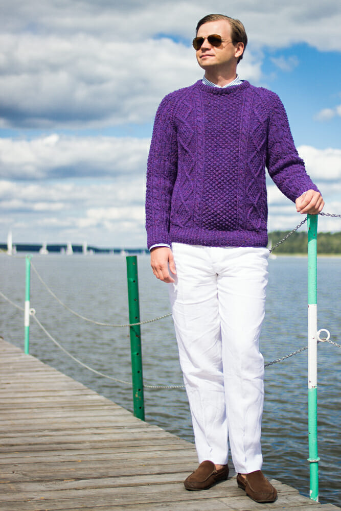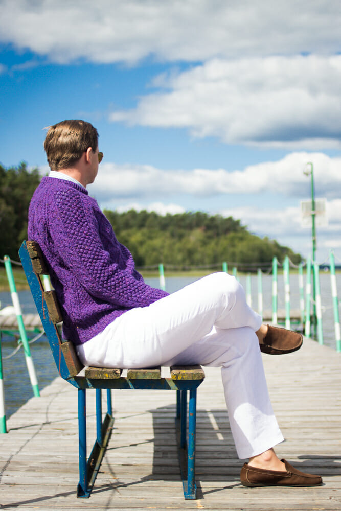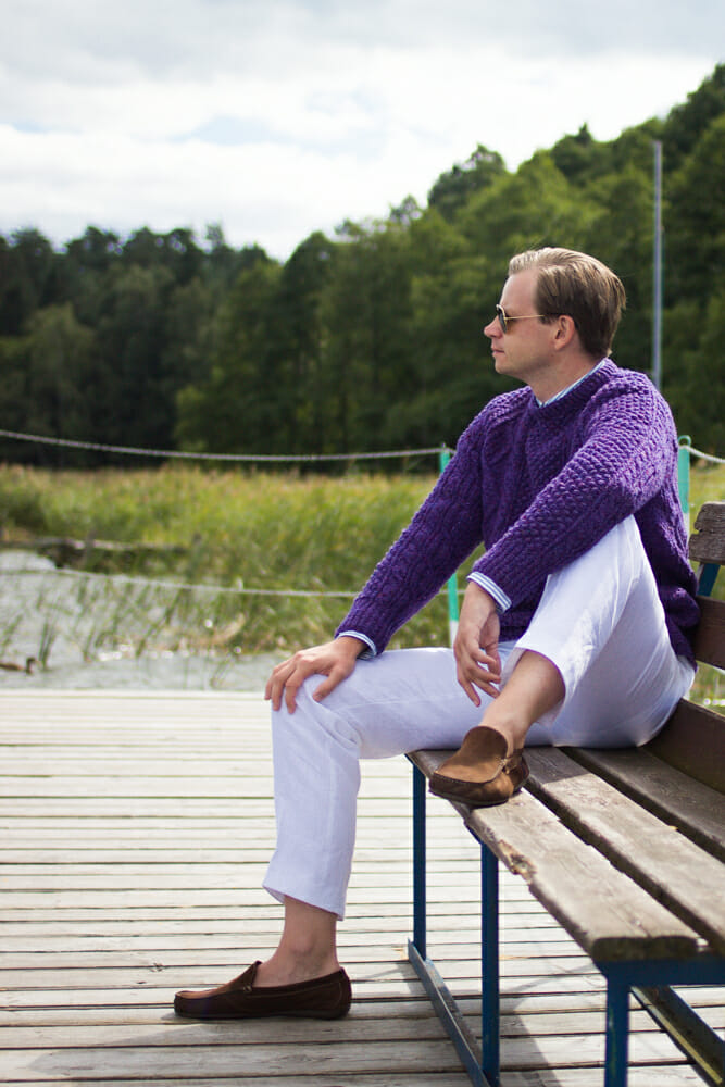 Sweter można komponować przede wszystkim ze sportowymi materiałami (len, bawełna, tweed, flanela, sztruks). Można go nawet założyć na marynarkę. Kiedy zrobi się chłodniej zakładam zwykle sweter irlandzki. Jego duża oddychalność sprawia, że tylko podczas dużych upałów jest w nim zbyt gorąco. Niech jego grubość Was nie zmyli. Jest luźno tkany. Do stylizacji użyłem spodni w kolorze białym. Do tego swetra trudno jest dobrać spodnie. Biały jest chyba najlepszym kolorem. Np. z żółtymi stałbym się jagodzianką z Olsztynka:) Spodnie są z lnu zostały niedawno uszyte przez krawca z Żukowa, Michała Stenkę. Ich krój i komfort noszenia oceniam wysoko. Dla osób mieszkających na Pomorzu zakład krawiecki Michała Stenki stanowi ciekawą alternatywę. O Michale więcej napiszę w przyszłym miesiącu przy prezentacji garnituru, który się obecnie u niego szyje.