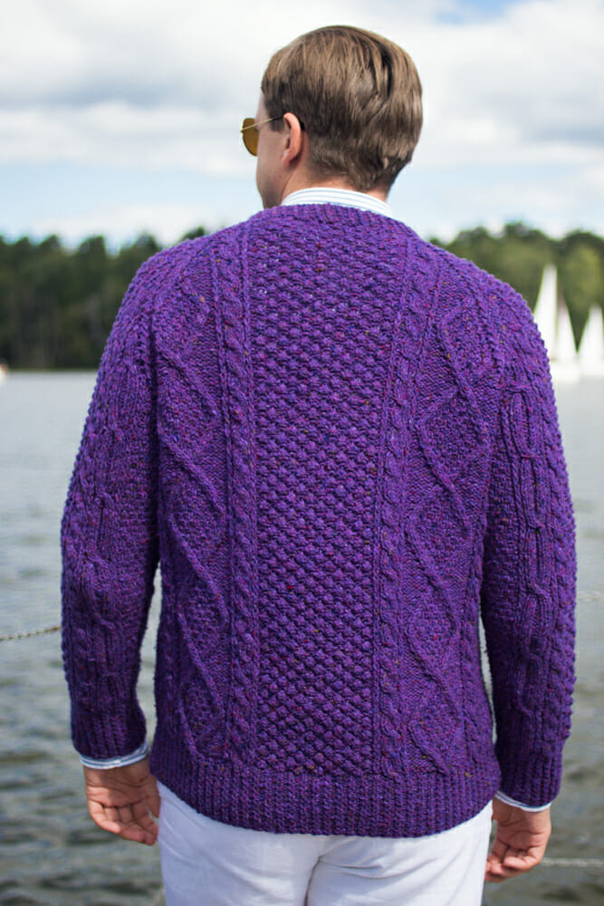Cechą charakterystyczną irlandzkich swetrów są wzory ściegów. Mój sweter w punkcie centralnym, zarówno z przodu jak i na plecach, ma ścieg jeżynowy. Jest to ścieg potrójny, który powstaje po zrobieniu trzech oczek z jednego i jednego z trzech. Owoce krzaka jeżyny (ang. blackberries) mają symbolizować Św. Trójcę. Irlandia należy do katolickiego kręgu kulturowego i występowanie motywów religijnych nie może dziwić. Do niedawna mieszkańcy Zielonej Wyspy uchodzili za bardzo oddanych wyznawców katolicyzmu. Obok motywu centralnego pojawiają się ściegi boczne. W pierwszej kolejności są to warkocze (ang. cables) oznaczające rybackie liny. Swetry są zwiane z podstawową formą gospodarki na irlandzkim wybrzeżu, czyli rybołówstwem. Liny na swetrze mają zapewnić bezpieczeństwo podczas połowów.