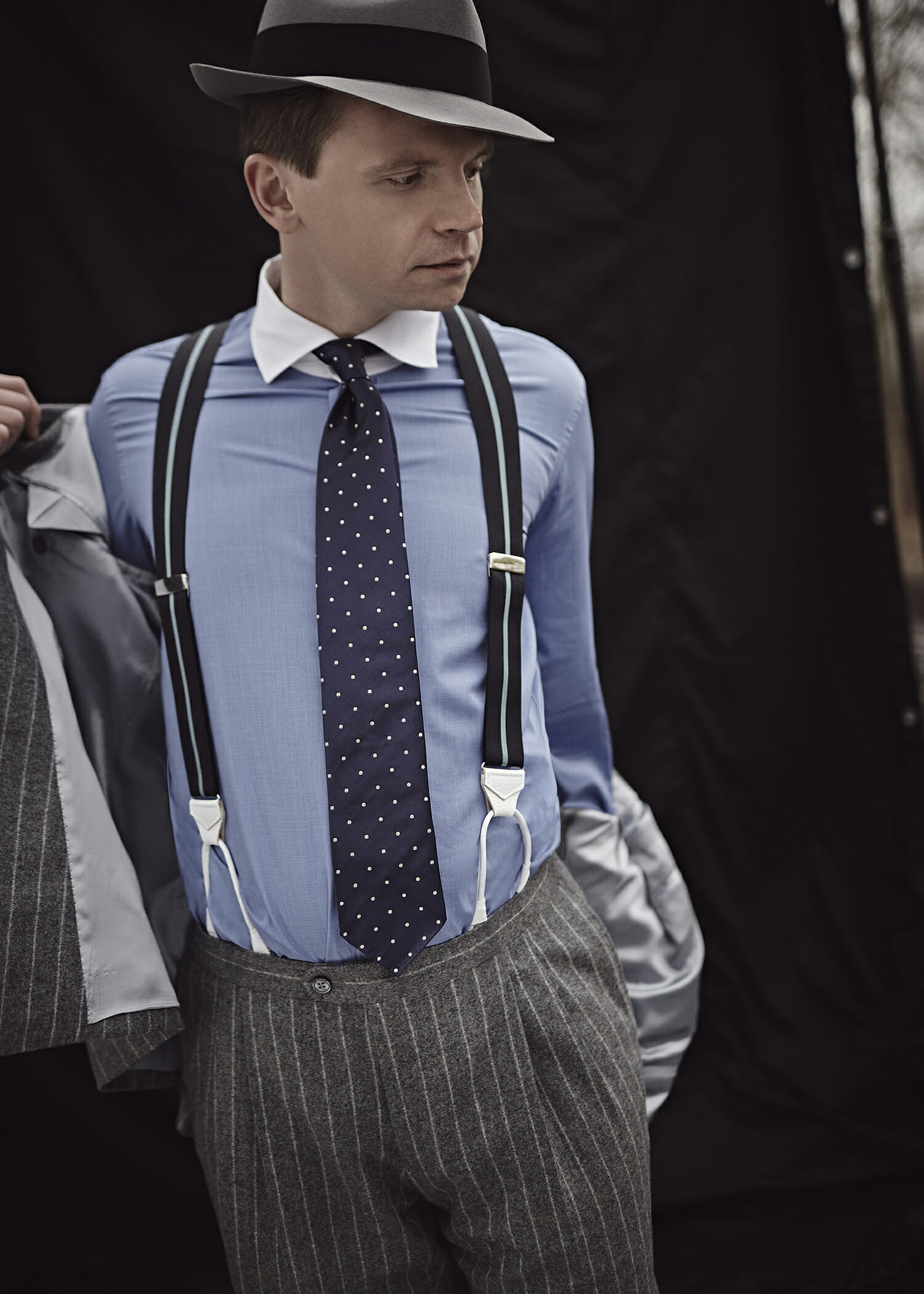 szelki albert thurston, koszula blekitna z boalym kolnierzem, krawat w kropki