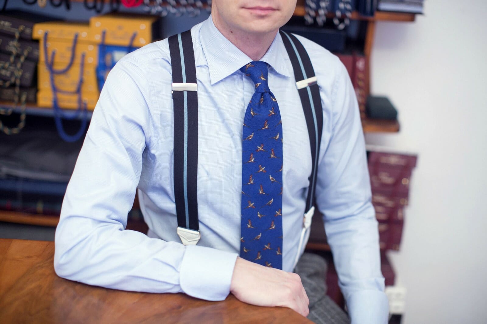 Często możemy się spotkać z szelkami zapinanymi na charakterystyczne żabki. Pamiętajmy jednak, ze jest to rozwiązanie mniej formalne. Ponieważ szelki na guziki zostały w Polsce niemal całkowicie zapomniane, muszę pokrótce przedstawić, jak się je nosi. Ale spokojnie, nie ma tu czarnej magii.