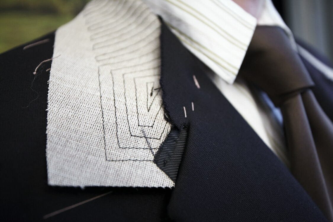 Podstawową zaletą garnituru na miarę, oprócz doskonałego dopasowania, jest zastosowanie płótna na etapie tworzenia marynarki. Używając terminologii samochodowej, to, co widzimy na zewnątrz garnituru to karoseria, ale to, co kryje się wewnątrz to tapicerka, fotele i podwozie. Ono decyduje o komforcie i trwałości marynarki. Marynarki sklepowe są najczęściej podklejone na fizelinie. Fizelina nie przepuszcza powietrza, co czyni z garnituru zbroję. Marynarka szyta na płótnie lub włosiance oddycha. Dzięki temu jest bardziej komfortowa i jest szczególnie zalecana w mocno ocieplanych pomieszczeniach. Marynarka na płótnie jest trudniejsza do uszycia, tu klapy i kołnierz są ręcznie pikowane. Dzięki temu klapy nigdy nie wywiną się na zewnątrz, kołnierz zachowa swój pierwotny kształt, a marynarkę można będzie nosić nawet kilkadziesiąt lat. Oczywiście przy założeniu, że marynarki będziemy rotować, a nie chodzić w jednej codziennie. Kołnierz na zdjęciu poniżej jest wykonany na płótnie, ale stebnowanie jest maszynowe (zob. komentarze).