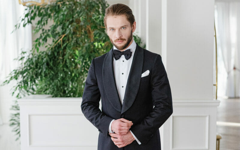 Jak powinien wyglądać smoking dwurzędowy midnight blue? Czy klapy szalowe do niego pasują? Jakie dodatki powinny uzupełnić zestaw?