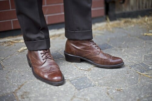 Spodnie z mankietem są wykonane z materiału cavalry twill. Jest to gruby diagonal stosowany kiedyś na mundury kawalerii. Szyto z niego także sportowe garnitury i stanowił bardziej wytrzymałą alternatywę dla flaneli. Do sportowych spodni dobrałem brązowe buty za kostkę z ozdobnym ażurem.