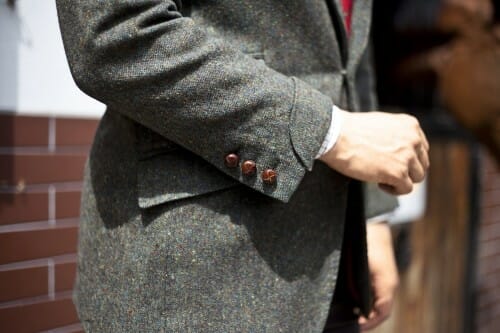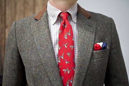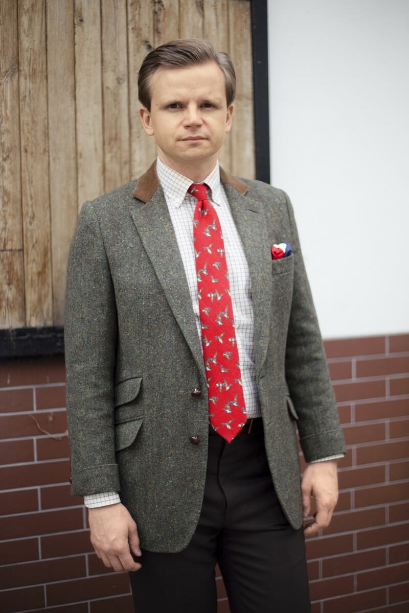 Widoczny na zdjęciach tattersall z bawełnianej tkaniny włoskiej firmy Testa założyłem do marynarki z donegal tweed uszytej prawie trzy lata temu przez śp. Czesława Orciucha. Marynarka ma sportowe, wywijane mankiety, skośne kieszenie z biletówką oraz skórzane guziki. Kontrastujący beżowy kołnierz z aksamitu wstawił w zeszłym roku Piotr Kamiński. Zestaw uzupełnia wełniany krawat z motywem zwierzęcym (kaczki) oraz poszetka z jedwabiu z flagą Wielkiej Brytanii. Dostałem ją rok temu w prezencie od Alistaira Brooksa, byłego już dyrektora zarządzającego Hardy-Minnis oraz Hunt & Winterbotham. Alistair postanowił otworzyć własną firmę i będzie produkował tkaniny płaszczowe dla luksusowych marek (m.in. Prada).