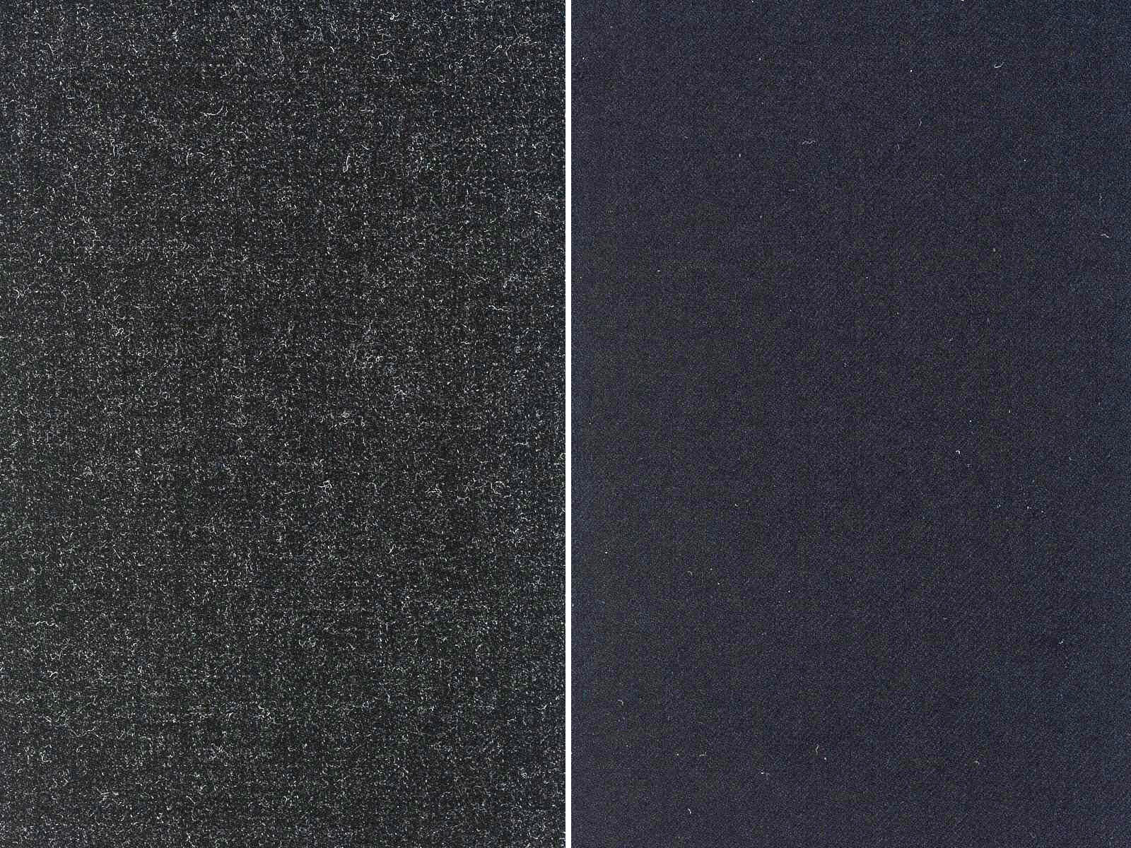 Ciemnoszara lub granatowa tkanina garniturowa o splocie skośnym. Twill weave
