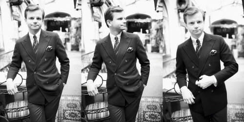 Paski na krawacie są zdecydowanie szerzej rozstawione, niż prążek w koszuli. Jedna z zasad mieszania wzorów mówi, że jeśli łączymy dwa takie same wzory ze sobą, powinny się one wyraźnie różnić wielkością. Zestaw koordynowany uzupełnia poszetka z motywem zwierzęcym, w kaczki oraz wiśniowe podwójne monki (buty zapinane na dwie klamerki).
