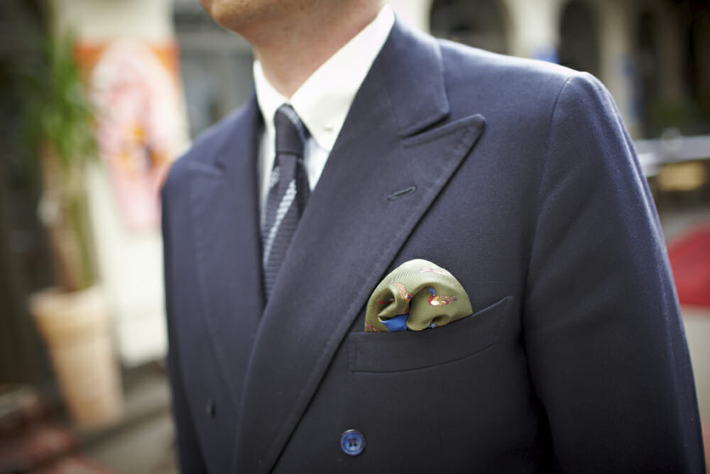 Poszetka w kaczki, krawat z grenadyny, koszula na spinkę i dwurzędowa marynarka