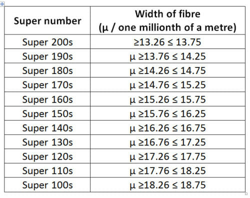 Posłużmy się przykładem super 110’s. Oznaczenie liczbowe wskazuje nam grubość włosa (włókna), z jakiego przędzona była nić, wykorzystana następnie do utkania tego materiału. 110’s ma grubość włosa w przedziale 17.76 – 18.25 mikrometra. W przemyśle odzieżowym średnica włosa mierzona jest z dużą precyzją – wyraża się ją za pomocą tysięcznych milimetra (mikrometrów, mikronów). Przędzę, zależnie od grubości, przypisuje się do kategorii z zakresu 100-220, co dziesięć.