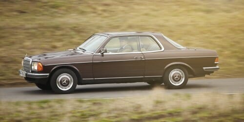 Mercedes Benz W123 230 CE coupé w akcji zdjęty z profilu