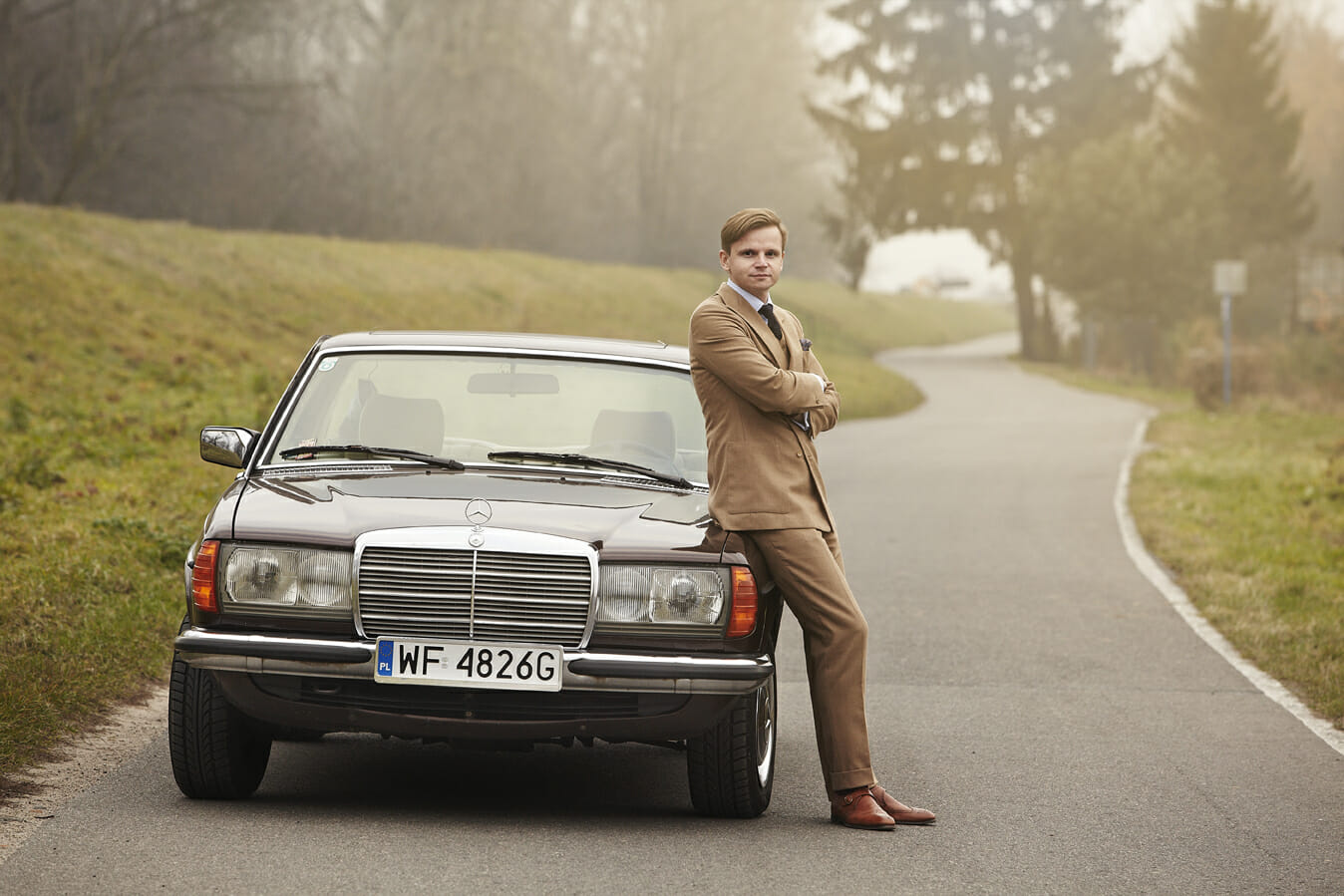 Mercedes Benz W123 230 CE coupé z przodu na drodze w Wilanowie