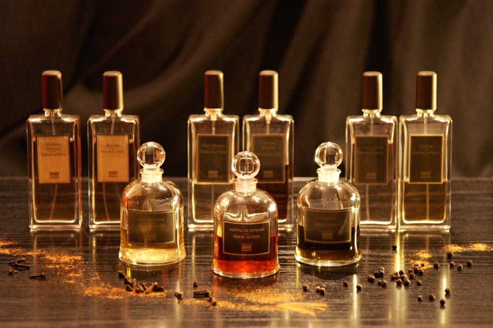 Butelki perfum Serge Lutens z ziarnkami kawy i cynamonem