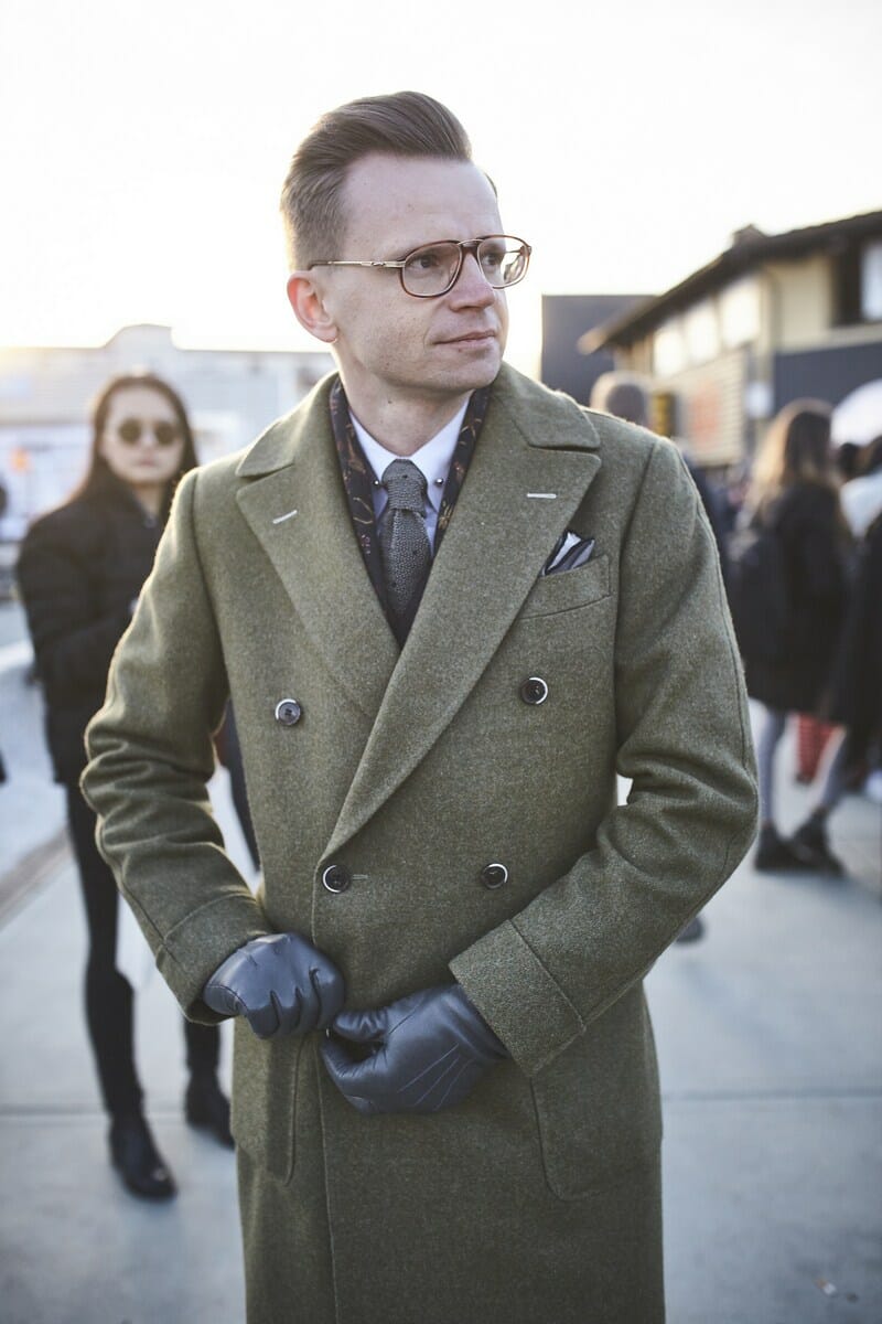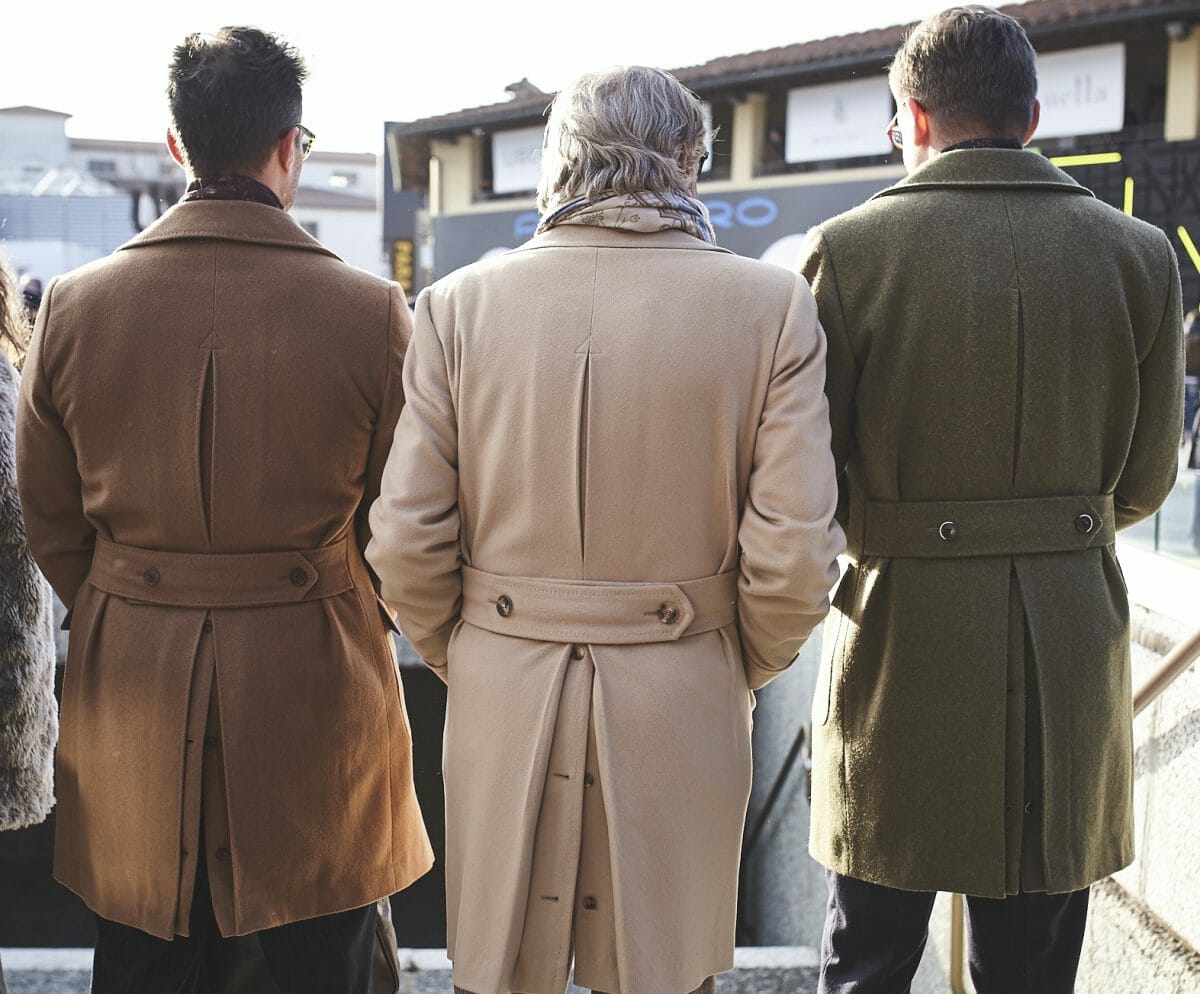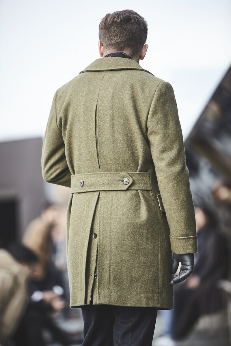 Jeszcze ciekawsze od przodów są jednak plecy. To chyba jedyne takie ubranie męskie, gdzie plecy mogą wydać się bardziej interesujące niż przody. Plecy są wyposażone w pas w poprzek pleców (dragon), pionową kontrafałdę (inaczej fałda niezaszyta) oraz długi szlic zapinany na guziki. Taki krój pleców zapewnia większą swobodę ruchu i chyba powraca do łask, bo był dosyć często widywany podczas tegorocznego Pitti. Przypuszczam, że takie ulstery zyskają wkrótce na popularności. W ogóle spodziewam się mody na zielony płaszcz, bo okrycie w takim kolorze doskonale urozmaica szaro-burą garderobę zimową.