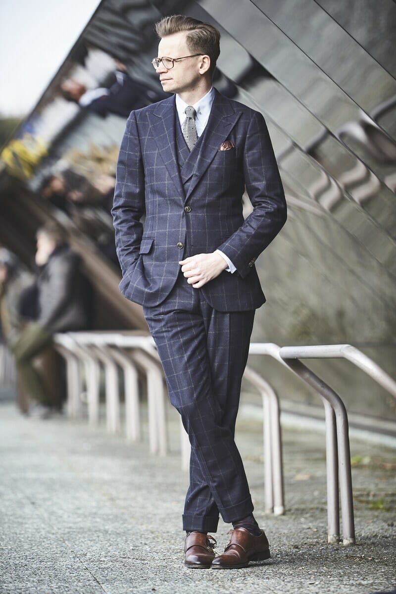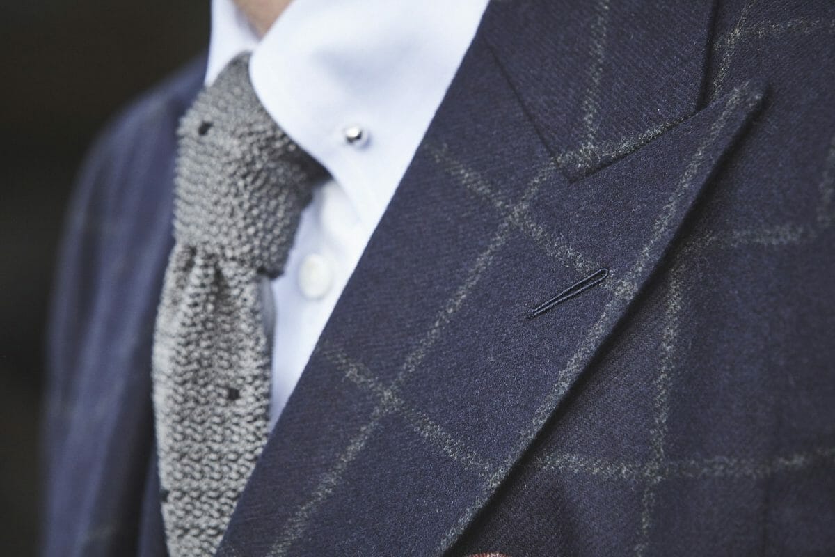 Podstawą mojego zestawu był trzyczęściowy garnitur z flaneli w kratkę windowpane. Został uszyty w systemie made to measure przez moją markę Zaczkiewicz (nie będzie dostępny jako ready to wear). Ma bardzo lekką, oddychającą konstrukcję full canvas. Zgodnie z tradycjami włoskiego krawiectwa marynarkę charakteryzuje koszulowe wszycie rękawa (spalla camicia). Z przodu jest zapinana na dwa i pół guzika, ale klapy postanowiłem zrobić w szpic. Pewnie zapytacie dlaczego? Po prostu klapy otwarte już dawno zaczęły mnie nudzić, więc czemu nie… Chciałem sobie coś takiego uszyć. W połączeniu z dwurzędową kamizelką wyszedł bardzo nietypowy garnitur.