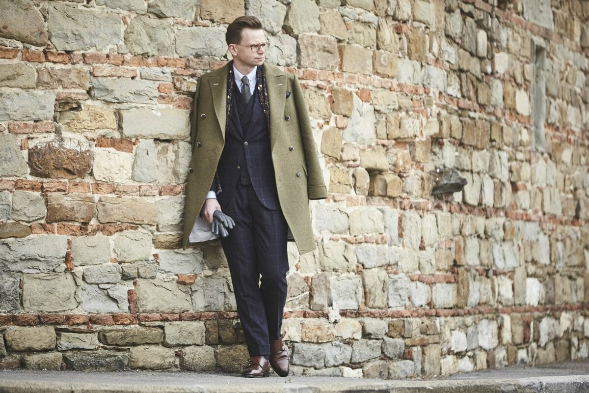 Pierwszego dnia założyłem dwurzędowy płaszcz ulster wykonany z wełny w kolorze British army green. Ma charakterystyczne szerokie klapy oraz sztormowy kołnierz. Wyróżniają go także nakładane kieszenie z patkami oraz wywijane mankiety na rękawach.